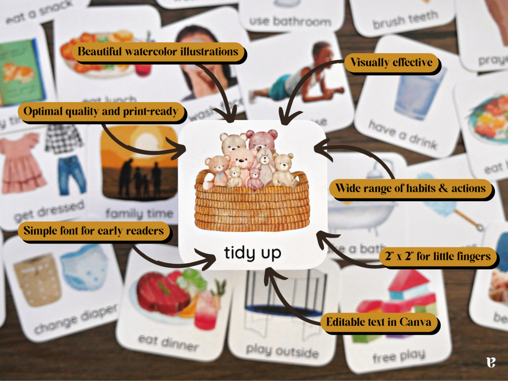 - 142 unique digital watercolor routine cards - 6 duplicated cards for additional uses per day